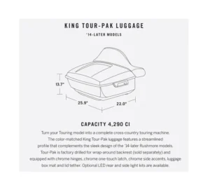 - Secure Storage: The King Tour-Pak Luggage offers ample storage space for all your essential gear, ensuring you can carry everything you need for your ride with peace of mind.